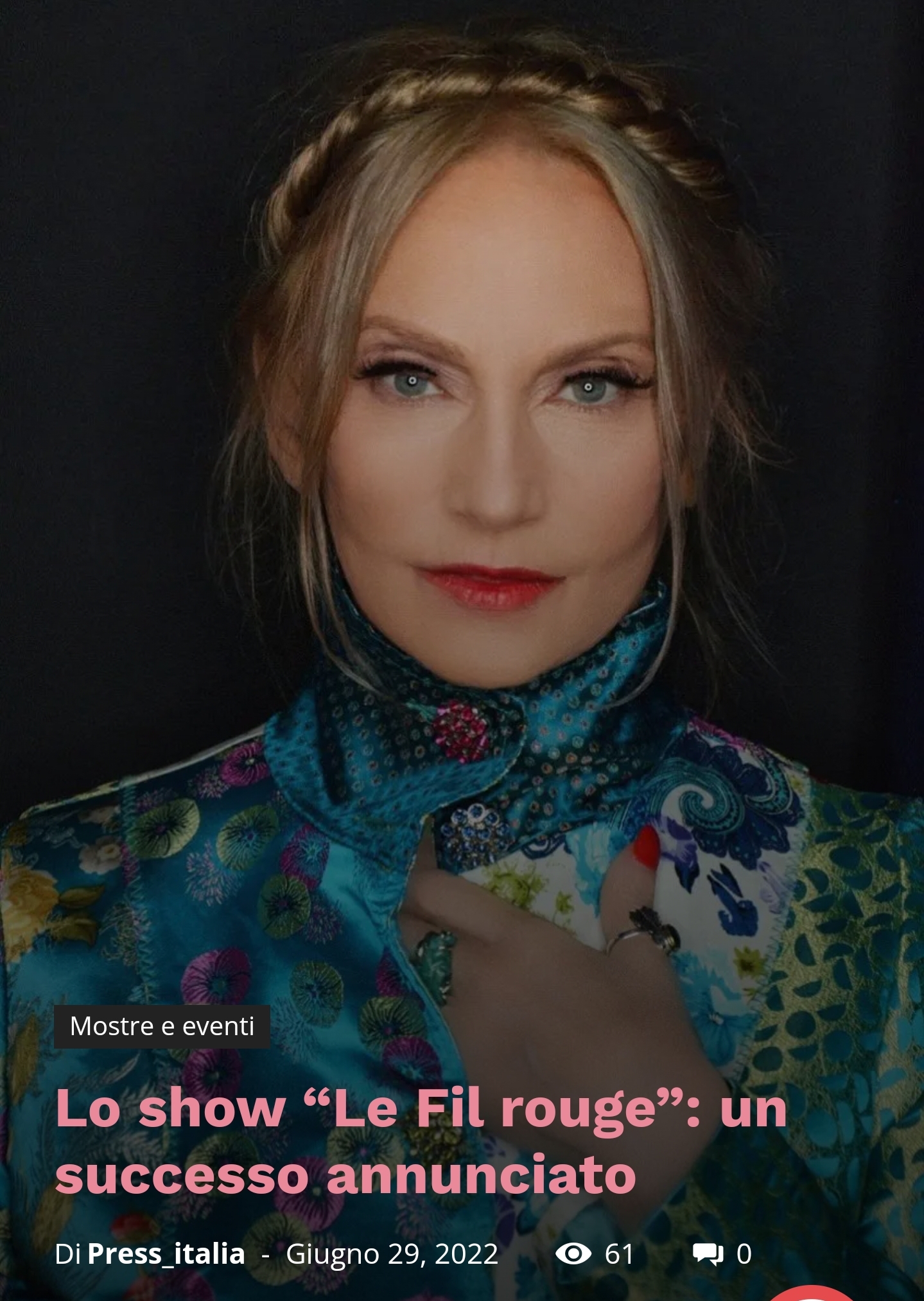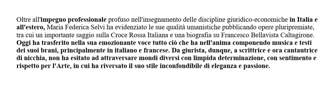 Ecco lo spot dell'Evento con percorso sensoriale che Maria Federica Selvi ha presentato il 25 aprile 2022 a Roma regalando al pubblico l'immagine di un'artista eclettica e completa che fonda la sua arte non solo sui testi musicali che compone e canta ma anche sulla pittura e sulla scrittura di biogafie, saggi e romanzi. I suoi quadri e i suoi libri raccontano uno spirito libero e profondo, così come rivelano i suoi racconti personali ed emozionanti, intessuti nello spettacolo con le sue originali canzoni in italiano e francese. La Stampa, come qui riportato da alcune testate giornalistiche, ha recensito con ottimi giudizi la serata elegante e originale riconoscendo all'Artista le sue doti umane e artistiche, del resto già sottolineate con il premio alla carriera al Leone d'oro a Venezia.